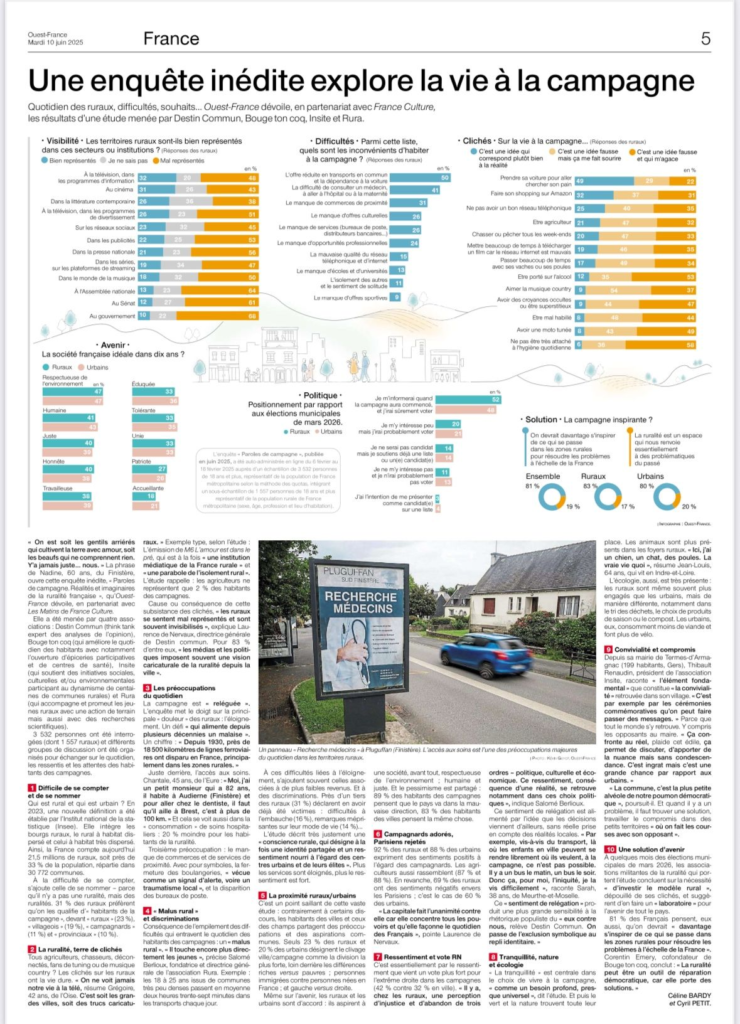 Alors que le milieu rural peine encore à se défaire de ses présupposés, une enquête récemment publiée par Ouest-France, en partenariat avec France Culture, sur « la vie à la campagne » vient bousculer bien des idées reçues. Un travail de longue haleine mené main dans la main avec BougeTonCoQ, Destin Commun et InSite France et des résultats édifiants qui ébranlent les clichés habituels d’une ruralité figée et passéiste.